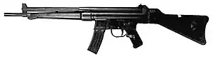 The origin of this rifle can be traced back to the final years of World War II when Mauser engineers at the Light Weapon Development Group (Abteilung 37) at Oberndorf am Neckar designed the MKb Gerät 06 (Maschinenkarabiner Gerät 06 or "machine carbine instrument 06") prototype assault rifle chambered for the intermediate 7.92×33mm Kurz cartridge, first with the Gerät 06 model using a roller-locked mechanism which was unique for being gas operated, as opposed to recoil operation, originally adapted from the MG 42 machine gun, but with a fixed barrel and conventional gas-actuated piston rod.[2] After observing bolt-bounce during firing trails of the roller locked Gerät 03 prototype semi-automatic rifle Dr. Karl Maier, one of Mauser's scientists at the time,[3] realized that with careful attention to the mechanical ratios, the gas system could be omitted.[4][5] The resultant weapon, the Gerät 06H (the "H" suffix is an abbreviation for halbverriegelt or "half-locked") was assigned the designation StG 45(M) (Sturmgewehr 45(M)).