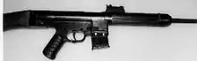 Like the German FG 42 battle rifle/automatic rifle and Sturmgewehr 44 assault rifle the StG 45(M) was one of the first inline firearms incorporating a "straight-line" recoil configuration. This layout places both the center of gravity and the position of the shoulder stock nearly in line with the longitudinal axis of the barrel bore, a feature increasing controllability by reducing muzzle rise during burst or automatic fire.[6] The elevated sight line over the bore axis layout was also adopted from these designs as it helps to extend the "battle zero" range. The current trend for elevated sights and flatter shooting higher-velocity intermediate cartridges in assault rifles is in part due to a desire to further extend the maximum point-blank range, which makes such a rifle easier to use.[7][8]