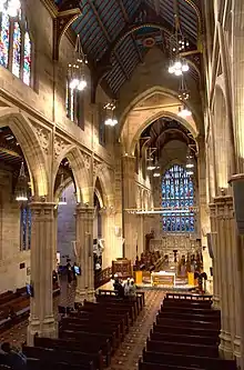 The erection of a chapter house was first mooted in 1883 to provide a synod hall in memory of Bishop Barker. Its construction was approved unanimously by the chapter and synod. Cyril Blacket, Edmund Blacket's son was appointed architect. The foundation stone was laid on 30 November 1885 and construction completed in 1886. The choice of site was limited, the south west corner of the site being the only vaguely suitable one. Even this was restricted. In 1916 additions enlarging the chapter house were completed by Wiltshire and Day. Calls for further enlargement continued but nothing was done due to the difficulty of the task.[2] The St Andrew's Cathedral Conservation Plan, 1999 by Paul Davies contains further detailed information on the chapter house, external works and structures, additions to the cathedral exterior, internal layout, 1941 reorientation, ventilation, organs, bells, architects and furniture.[2]