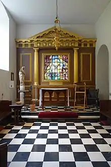 The church contains stained glass and a mural – depicting the Holy Spirit as a dove – by Brian Thomas.