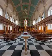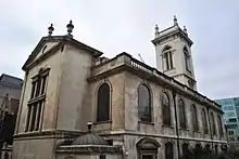 The medieval St Andrew's survived the 1666 Great Fire of London,[8] saved by a last minute change in wind direction,[9] but was already in a bad state of repair and so was rebuilt by Christopher Wren anyway.[10] In what is his largest parish church, he rebuilt from the foundations (creating the present crypt) and gave the existing medieval stone tower (the only medieval part to survive) a marble cladding. Its rector from 1713 to 1724 was Henry Sacheverell, who is buried beneath the church's altar.[11]