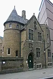 As part of this improvement scheme the church received compensation to replace its assets, and the Gothic architect Samuel Sanders Teulon was commissioned to build a new rectory and court house on the south side of the church – this now operates as the offices for the foundation, the associated charities and the Archdeaconry of Hackney, as well as the rectory and the conference rooms. Teulon incorporated into the court room, the building's main room, a 17th-century fireplace.[16] This was from the 'Quest Room' for the 'below Bars' part of the parish, i.e. that lying outside the city boundary, sited as part of a block of buildings in the middle of the main street. This block was removed as part of the Holborn Viaduct improvements and explains why Holborn is so wide at this point.[17]