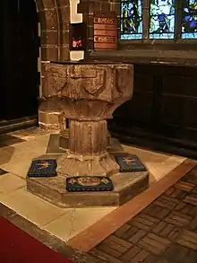 The nave measures 55 feet (17 m) by 19 feet (5.8 m).[3] The north and south arcades have four bays; the north has round piers with moulded bases and capitals and the south has octagonal columns, also with moulded bases and capitals.[1][3] There is an inner and an outer aisle to the north, separated from each other by an arcade of four pointed arches and octagonal piers.[3] The font is octagonal with concave sides, each featuring a shield.[3][4] The shields contain symbols of the Passion and the initials of Lawrence Towneley.[1] The pulpit is constructed of oak on a stone base.[3]