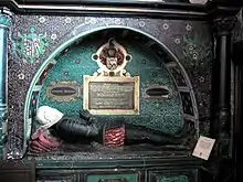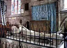 Sir Hugh Calveley (died 23 April 1394) was an English knight and commander, who took part in the Hundred Years' War, gaining fame during the War of the Breton Succession and the Castilian Civil War. He held various military posts in Brittany and Normandy. He founded the college of which St Boniface was the collegiate church, in the 1380s. His alabaster tomb and effigy is in the centre of the chancel and is enclosed within contemporary ironwork,[13] though there is some doubt as to whether he was in fact buried there. The niches in the sarcophagus originally contained weepers (small figures of mourners).[12] The effigy was likely commissioned by Sir Robert Knolles.