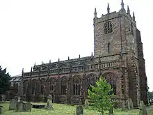 The church, built in red sandstone with a lead and slate roof, is mainly Perpendicular in style.[1] At the west end a tower leads to a broad six-bay nave and narrow eight-bay north and south aisles which enclose the tower. The three-bay chancel is narrower than the nave and leads to a sanctuary with a vestry to the north. To the south of the chancel is the Ridley chapel. A south porch extends from the fifth bay from the west.[10] The tower has a west doorway above which is a three-light window. The ringers' windows are single lancets, and the belfry windows are of four lights. The top of the tower is surmounted by battlements and pinnacles.[2] The parapet of the north aisle consists of stone openwork with crocketed pinnacles; the parapet of the south aisle is crenellated.[1]