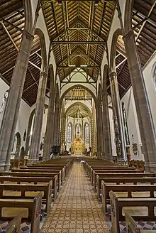 In the 1960s a number of the fittings, including Pugin's screen, were removed and the interior repainted, to the detriment of the original design.[3][8] The rood screen was rescued by an Anglican priest, who had it re-erected in the Anglican Holy Trinity Church, Reading.[9] Other artefacts were removed to other churches, including the giant rood crucifix, which after its removal to the Church of the Sacred Heart & St Therese, in Coleshill, was reinstated in the cathedral within the Sanctuary on the instructions of Archbishop Maurice Couve de Murville. The Cathedral as it appears today is a result of post-Vatican II renovations and re-orderings, with only some of Pugin's work surviving. The original chancel arrangement was altered, again much to the detriment of its design, destroying Pugin's intent. Its appearance today is a mere shadow of how it was originally conceived by Pugin, but its enduring beauty in the face of iconoclasm is testament to the skill of its original designers. St Barnabas Cathedral in Nottingham, also by Pugin, suffered similarly, with much of the original decoration smothered with whitewash, and fittings destroyed.