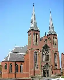 St Chad's replaced a smaller church dedicated to St Austin, built on the same site in 1808, in the Gunmakers' Quarter of the town on steeply sloping land that fell away to the canal and wharf.[8] Because of the narrow site, and the necessity to build in brick rather than stone, Pugin was restricted in the style and proportions of the church that he could design. Because he wished to make the church as open and spacious as possible, he looked as a model to the style of churches that were built in Northern Germany in the late Middle Ages.[3] St Chad's is built in the style of a brick hall church or "hallenkirke", similar to Munich Cathedral and has a westwerk with narrow broached spires similar to those of Lübeck Cathedral. Because of the steep slope of the site, Pugin built a large crypt beneath the building, to be used primarily as a burial place for family tombs,[3] and former cathedral clergy, and is now rehearsal room for the choir. The geographical alignment is unusual in that the "east end" (the location of the altar) actually faces approximately north west.