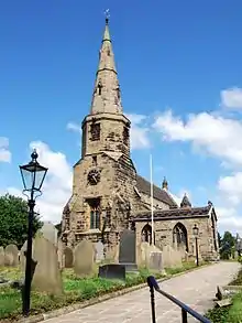 In the churchyard, there are some grave slabs from the Middle Ages that were originally inside the church.[1] There is a sandstone sundial in the churchyard, dating from 1725.[8] Its base has two square steps and there is a baluster stem; the gnomon is probably modern. The sundial has been given a Grade II designation by English Heritage.[9] There is also an octagonal sandstone baptismal font in the churchyard from the 19th century. The font has also received a Grade II listing.[10]