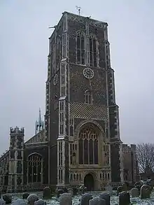 The church is renowned for its East Anglian flushwork, especially that of the tower. Knapped and unknapped flints are arranged in patterns, textures and designs and create the stone work. The curving letters over the west window are most famous: SCT. EDMUND ORA P. NOBIS (St Edmund pray for us). Each letter is crowned, and set in knapped flints. Originally roofed in lead, from 1948 to 2015 the church had a copper clad roof with an easily recognisable flèche (or spirelet), above a clerestory of eighteen windows. The flèche was purely for display, and has never contained a bell. The tower has no parapet and is a very fine piece of architecture, with its large bell openings. The roof of the nave is so high that it makes the tower seem shorter than it really is; but it is at least 100 feet high. All of the church's medieval glass was destroyed by William Dowsing in 1644; the only stained glass windows in the church are the east windows over the altar (1954, by Sir Ninian Comper) and the west window below the grand tower. In World War II the church was narrowly missed by a German bomb that destroyed houses in the nearby Hollyhock Square. The bomb did not do much damage to the building itself but blew out most of the windows - another reason why the church has very little stained glass. The church was tidied very quickly for the funerals, a short while later, of the people killed by the bomb.
