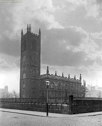 The residential area around the church changed in character during the 19th century, as properties once occupied by affluent families became lodging houses and the locale became a place of business.[4] Falling attendances led to a merger with St Matthew's parish in 1927.[5] In 1929, the Ecclesiastical Commissioners proposed to hand over the site to Manchester Corporation, in the hope that it would be converted into an open space similar to Parsonage Gardens.[6] The church was demolished in 1931.