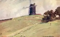 St Leonard's Mill was built in 1760, originally standing in Iham. It was shown at that site on the 1808 Ordnance Survey map, and was still there in 1813. By 1823 the mill had been moved to the new site, which was on the remains of St Leonard's church. An accident when fitting a new stock to the mill in 1861 resulted in the death of Benjamin King, millwright. The mill was working until the 1890s and was derelict by the 1920s. It was repaired in 1935 and dummy sails fitted, which did not last long. The mill was again repaired in 1955. The National Trust became custodians of the mill in 1975. In February 1978, the back of the mill was blown out in a gale.[1] The windmill was blown down on the morning of 16 October 1987.[2] The wreckage of the mill was still to be seen on site the following March. One of the millstones was salvaged and used in the restoration of Lowfield Heath Windmill.[3] The site of the windmill is now marked by Winchelsea's Millennium Beacon.[4]