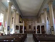 A Valletta landmark due to its spire rising over 60 metres, it is constructed with Maltese limestone in a neo-classical style.[1] The cathedral has columns with capitals of the Corinthian order while the capitals of the six columns of the portico are of the Ionic order.[5] The internal dimensions of the building are 33.5 metres x 20.4 metres. Behind the main altar is a painting titled Ecce Homo, the work of A E Chalon, donated in 2014.