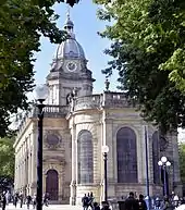 St Philip's Church was planned when the nearby medieval church of St Martin in the Bull Ring became insufficient to house its congregation because of the growing population of Birmingham. The land, previously named the Barley Close, was donated by Robert Philips in 1710. It is one of the highest points in the district and is said to be at the same level as the cross on St Paul's Cathedral in London.[1] Following an Act of Parliament, construction commenced in 1711, to the design of Thomas Archer,[2] and was ready for consecration in 1715, when it was dedicated to the Apostle Philip as a tribute to the benefactor Robert Philips. It appears to have been Archer's first church, apart from a rebuilt chancel at Chicheley attributed to him. Construction was estimated to cost £20,000, but the final figure was only £5,012.[2] (equivalent to £790,000 in 2019).[3] This was because many of the materials were donated and transported to the site at no cost. St Philip's served as a Parish church from 1715 to 1905.