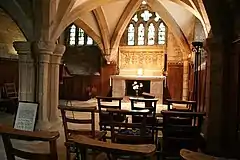 The crypt chapel was probably dedicated to the Holy Trinity and was originally entered from outside. A staircase was built in the 15th century allowing access from the church interior. The crypt door and chests are the only remaining examples of medieval woodwork in the church.