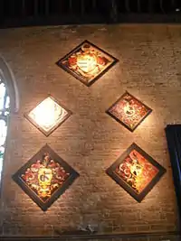 On the south wall are royal coats of arms; and five hatchments commemorating Anne, widow of Sir Richard Cust, Bt., who died 29 December 1779, John Manners, illegitimate son of Lord William Manners, William Richard Middlemore of Somerby Hall,[13] who died 7 March 1772, aged 42, John Middlemore of Somerby Hall who died abroad in 1770 and Henry Pennant Esq.,[14] born 1713, died unmarried on 31 May 1772 and buried at St Wulfram's on 2 June 1772.