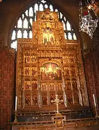 A brass cross on the super-altar was designed by Arthur Blomfield in 1886. The medieval font from about 1496 has an ornate cover shaped like a church spire designed by Sir Walter Tapper in 1899 to celebrate the Diamond Jubilee of Queen Victoria. The cover's interior is decorated with carvings of Edward the Confessor, St Hugh and St Wulfram.[9] Before the cover was added, the font stood on a low stone plinth but is now raised. Each of the font's eight faces, its shaft and base is covered with carvings which are worn and damaged, but appear to show the Annunciation, the Nativity, the Circumcision of Jesus, the Baptism of Jesus, Christ blessing the little children, the Transfiguration, the sacrifice of Isaac and the Three Wise Men. Emblems and devices on the underside of the font include a pelican and a Tudor rose which may suggest the font's donor was Richard Foxe, from Ropsley, who re-founded the King's School, Grantham. Four emblems – an angel, a lion, an ox and an eagle may denote the Four Evangelists. The font shaft has seven figures and an empty eighth space. St Andrew and his cross are identifiable. The font base has roses, quatrefoils and masks.[12]