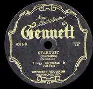 The original sheet music publication of "Stardust" was published under the title "Star Dust" by Mills Music with a copyright date of 1929.[8] The first recording of the song (Gennett 78, 6311-B.), which was made by Hoagy Carmichael in 1927 before the writing of the song's lyrics, was titled "Stardust". Carmichael referred to his song as "Stardust" in a 1936 letter to M.B. Yarling of the Sears & Roebuck Company's Radio and Publicity Dept.[9] He also referred to the song as "Stardust" in his memoir The Stardust Road while relating the story of its composition.[10] In his book Stardust Melodies: The Biography of Twelve of America's Most Popular Songs, Will Friedwald states, "the correct title is given as two words, 'Star Dust'".[11]