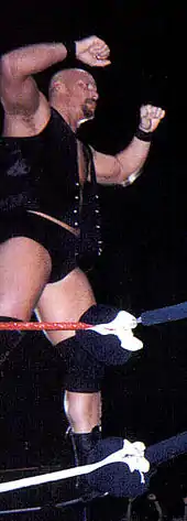 Austin soon thought the Ringmaster idea was weak and so asked for a change.[34] The WWF gave him a list with names inspired by murderer "The Iceman" Richard Kuklinski, all of which he hated; these included Otto Von Ruthless, Ice Dagger, Fang McFrost, and Chilli McFreeze.[34] Having battled thinning hair for over a year, Austin shaved his head and later elaborated in a May 2017 interview, "After watching the Pulp Fiction movie with Bruce Willis, that's the haircut that inspired me. [...] I was travelling on the road with Dustin Rhodes and before I went to the show, I said fuck it. I went into the bathroom with a razor blade and shaved all my hair off. [...] Then I grew the goatee and everything came full circle."[47] On March 11, "The Ringmaster" moniker (now merely a prefix to his ring name) would be discarded in favor of his most famous nickname, "Stone Cold". The new name was prompted by his then-wife Jeanie, an English woman who had made a cup of tea for him and told him to drink it before it became "stone cold".[48] His new persona was inspired by Kuklinski.[49]