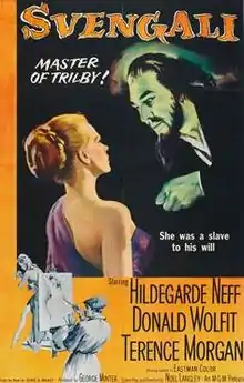Svengali is a 1954 British drama film directed by Noel Langley and starring Hildegard Knef, Donald Wolfit and Terence Morgan.[1] A svengali hypnotises an artist's model into becoming a great opera singer, but she struggles to escape from his powers. It was based on the 1894 novel Trilby by George du Maurier.