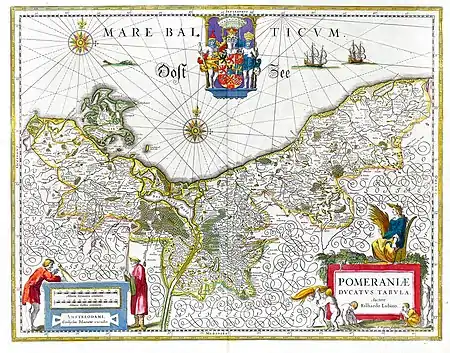 On 20 July, after having persuaded Bogislaw that he should be allowed to enter the city (up to this point, there had not been a single Swedish casualty), the Swedes marched into the city.[56] A treaty was concluded between the two powers, which effectively stripped Pomerania of its sovereignty, and other matters of the city and duchy were settled to the king's satisfaction.[56] The king then received contributions from the duke and swapped out Damitz' force and placed three of his own companies to garrison the city.[56] Bogislaw sent an embassy to the Emperor, informing him of the situation that had just transpired, but the Emperor declared that the entirety of Pomerania was in revolt, and looting and pillaging in the country was permitted on an even more extensive scale.[56]
