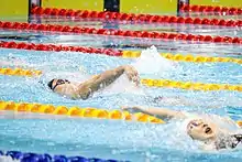 Filipino swimmer Chloe Isleta (left) competes in the women's 200m backstroke