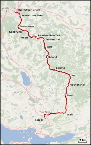 The line runs from a northern terminus in Winterthur Hauptbahnhof, the main station of the city of Winterthur, to a southern terminus at Rüti ZH station, on the railway line from Zürich to Rapperswil via Uster. In so doing it passes through the Zürcher Oberland following the valleys of the Töss river and Jona river.[2][3]