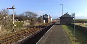 The station is unmanned and has no ticketing provision – all tickets must be bought in advance or on the train. The station buildings still stand and are now used as a private residence;[2] basic waiting shelters are provided for passenger use on each side. Digital display screens, timetable posters and a telephone provide train running information. Step-free access is available to both platforms via ramps from the road that crosses the line here, though the gradient on both makes the station unsuitable for wheelchair users.[3]