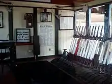 Moveable objects at the signal box complex include a platform lamp oil, (AA01); three cane hoops, two large, one small; a collected tickets box (AA13); compactus in the training room; a sign, pillows for hire 1/-, 0.5/0.5, (AS01); a circuit phone wall mounted timber, (AT01); a timber rotating chair with leather cushion and central cut-out, (CA03); and a timber table and ruling rod, 0.9/0.7/0.8, (TA01).[2][9]