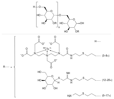 | Formula | (C6H10O5)n(C19H28N4O9S99mTc)3–8(C13H24N2O5S2)12–20(C5H11NS)0–17 |