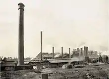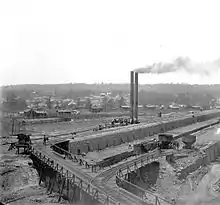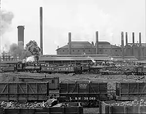 Canny investments and the purchase of major competitors in 1888 and 1892 under the direction of financier Hiram Bond, TCI Corporate General Superintendent, saw the firm grow rapidly. The corporation was for several decades one of the few major heavy industries based in the largely agricultural Southern United States,[3] by a wide margin the largest blast furnace operator in the South and at one time the second largest steel producer on the continent.[2][3] Its 1900 asset sheet listed 17 blast furnaces, 3256 beehive coke ovens, 120 Solvay coke ovens, 15 red ore mines,[2] as well an extensive network of railroads, although following the panic of 1893 the company shifted its primary interests from railroads to steel.[1] TCI's largest industrial plant was located in Ensley, a company town founded in 1886 on the outskirts of Birmingham, Alabama, by company president Enoch Ensley. Ensley (map of) was served by the sizable Birmingham Southern Railroad, one of TCI's early acquisitions, and from 1899 contained four 200-ton blast furnaces. In 1906 two more furnaces were constructed, and 40,000 tonnes of steel were produced that year, feeding Ensley's integrated rail, wire and plate mills. The company was fiercely competitive with the larger Pittsburgh steel businesses to the north, owing to the remarkable fact that all the natural resources required to produce steel were located in abundance within a relatively small radius of the Birmingham mills.[4]