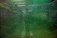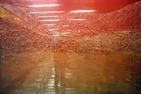 Terminal Aérea station has six murals painted by Mexican artist David Lach in 1981, becoming the first person to do it inside the Mexico City Metro.[30] Four murals, titled Paisajes cálidos y fríos,[31] are located at the end of each platform (Cálidos in the southern walls and Fríos in the northern walls).[8] According to Lach, the red and green colors represent direction and temperature.[32] The other two murals are located in the lobby and are titled Tlaltilco (east lobby) and Cuitzeo (west lobby).[8][31] They represent a mixture of the pre-Columbian era with contemporary Mexico.[30]