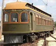 The THI&E was a very typical Midwestern interurban line, operating six far-reaching lines out of Indianapolis to mostly small and midsized prairie cities using large and heavy wood combines like the one pictured. Tracks and right-of-way quality varied. Some track ran tightly adjacent to a steam railroad, some track ran cross country and was very substantial featuring expensive cut-and-fill construction to provide a direct and flat right of way, and some was meandering side of a country road and went up and down with the road and the terrain plus would occasionally jog from one side of the road to the other depending on how uncooperative a farmer had been when the line was constructed. The THI&E's busier lines had color signal block protection which was rare at the time. Many interurbans, including the other major Indiana interurbans and in particular Union Traction, suffered major wrecks as the result of few or no block signals. Most THI&E passenger service was hourly, and main routes also saw package express service. THI&E's limited stop express to Terre Haute from Indianapolis was named the "Highlander." The "Ben Hur Special" ran to Crawfordsville, and the "Tecumseh Arrow" ran to Lafayette. Eventually the most valuable route in terms of both passenger and freight business, its eastward to Richmond line, connected to the Dayton and Western at Richmond, and the two companies combined for a profitable and busy Indianapolis to Dayton service. In the 1920s, the two ran express passenger service between the two large cities, and the freight interchanged from Ohio interurbans by way of the Dayton and Western became financially very important. The THI&E was never prosperous enough to replace its aging fleet of wood interurban cars,.[1][2] but many were modernized. Much of the THI&E's various town streetcar lines were eventually equipped with new one-man Birney streetcars. The THI&E used the huge Indianapolis Traction Terminal along with its neighboring Indianapolis interurban companies.[3]