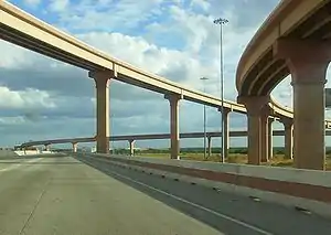 The Texas Department of Transportation's Laredo District is preparing for future growth with plans to upgrade Loop 20 into a freeway by building overpasses at major intersections and constructing frontage roads.[2] A short freeway section, which is co-signed with both Interstate 69W and U.S. Highway 59, currently exists from the World Trade International Bridge east to Interstate 35 and TxDOT recently constructed a diamond interchange at Loop 20's intersection with U.S. Highway 59 in eastern Laredo;[3] the stack interchange with Interstate 35, locally known as the Milo Interchange, is partially complete. As of 2008, TxDOT planned to complete interchanges and overpasses at all of Loop 20's major intersections within the next ten years.[4]