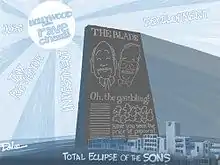 In October 2011, The Blade filed a lawsuit against rival publication the Toledo Free Press, claiming that former Blade general manager and current Free Press publisher Thomas F. Pounds violated a 2004 separation agreement containing a non-compete clause.[11] According to the Free Press, The Blade took exception to an editorial cartoon criticizing The Blade's stance on downtown development plans by Rave Cinemas and Hollywood Casino Toledo; The Blade cited the cartoon among the grounds for its lawsuit: "On or about August 21, 2011, Pounds... permitted Toledo Free Press to publish a cartoon that depicted a characterization of John R. Block and Allan Block together with The Blade as casting an eclipsing shadow on jobs, tax revenue, investment and development in Toledo, Ohio."[12]