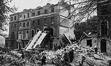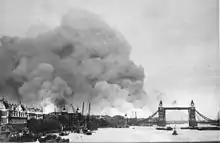 Wartime observers perceived the bombing as indiscriminate. American observer Ralph Ingersoll reported the bombing was inaccurate and did not hit targets of military value, but destroyed the surrounding areas. Ingersol wrote that Battersea Power Station, one of the largest landmarks in London, received only a minor hit.[109] In fact, on 8 September 1940 both Battersea and West Ham Power Station were both shut down after the 7 September daylight attack on London.[110] In the case of Battersea power station, an unused extension was hit and destroyed during November but the station was not put out of action during the night attacks.[111] It is not clear whether the power station or any specific structure was targeted during the German offensive as the Luftwaffe could not accurately bomb select targets during night operations.[112] In the initial operations against London, it did appear as if rail targets and the bridges over the Thames had been singled out: Victoria Station was hit by four bombs and suffered extensive damage.[112] The bombing disrupted rail traffic through London without destroying any of the crossings.[113] On 7 November, St Pancras, Kensal and Bricklayers Arms stations were hit and several lines of Southern Rail were cut on 10 November. The British government grew anxious about the delays and disruption of supplies during the month. Reports suggested the attacks blocked the movement of coal to the Greater London regions and urgent repairs were required.[114] Attacks against East End docks were effective and many Thames barges were destroyed. The London Underground rail system was also affected; high explosive bombs damaged the tunnels rendering some unsafe.[115] The London Docklands, in particular the Royal Victoria Dock, received many hits and Port of London trade was disrupted. In some cases, the concentration of the bombing and resulting conflagration created firestorms of 1,000 °C.[116] The Ministry of Home Security reported that although the damage caused was "serious" it was not "crippling" and the quays, basins, railways and equipment remained operational.[117]
