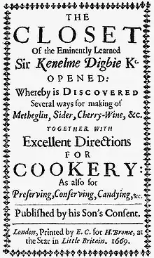 The Closet of the Eminently Learned Sir Kenelme Digbie Kt. Opened,[lower-alpha 1] commonly known as The Closet Opened, is an English cookery book first printed in 1669. It is supposedly based upon the writings of Sir Kenelm Digby, being as the title page states "published by his son's consent".