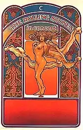 Tour manager Sam Cutler introduced the Rolling Stones as "the greatest rock and roll band in the world", a title he had first bestowed upon them at their concert in London's Hyde Park the previous July.[8] The tour set lists were derived mostly from 1968's Beggars Banquet album and the forthcoming Let It Bleed. The performance itself featured the Stones showmanship that would become familiar: Charlie Watts businesslike drumming leavened by an occasional wry smile, Bill Wyman's undertaker persona on bass, the guitar interplay of Mick Taylor with Keith Richards, and most of all Mick Jagger's prancing, strutting, leering and preening in front of the crowd.[3][6] "Ah think I've busted a button on my trousers, I hope they don't fall down" he teased the audience. "You don't want my trousers to fall down, now do ya?"[9] At one point in some shows, Jagger motioned for the audience to rush past ushers to the edge of the stage;[5] of the group's reaction to the crowd's fervor, a spokesman said, "They loved it."[5]