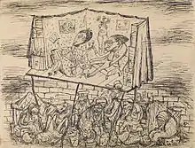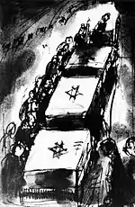The visual arts were developed by a circle of artists, including Bedřich Fritta, Norbert Troller, Leo Haas, Otto Ungar, and Petr Kien, who were officially employed by the Arts Department of the self-administration to create drawings and graphs of work at Theresienstadt on the orders of the SS. The artists, however, depicted the ghetto's actual conditions in their spare time.[117] Several of these artists were caught smuggling their work out of the ghetto. Accused of "atrocity propaganda", they were arrested on 20 July 1944 and tortured at the Small Fortress.[49] Much of their artwork was not rediscovered until many years later, but has been a useful tool for historians to glimpse the ghetto elite as well the widespread misery in the ghetto.[118]