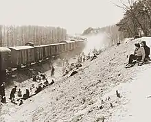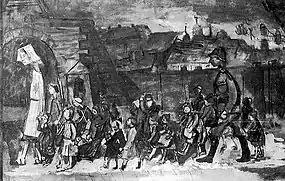 The first transport from Theresienstadt left on 9 January 1942 for the Riga Ghetto. It was the only transport whose destination was known to the deportees; other transports simply departed for "the East".[16] The next day, the SS publicly hanged nine men for smuggling letters out of the ghetto, an event that caused widespread outrage and disquiet. The first transports targeted mostly able-bodied people.[17] If one person in a family were selected for a transport, family members would typically volunteer to accompany them, which has been analyzed as an example of family solidarity[18] or social expectations.[19] From June 1942, the SS interned elderly and "prominent" Jews from the Reich at Theresienstadt. Due to the need to accommodate these Jews, the non-Jewish Czechs living in Theresienstadt were expelled, and the town was closed off by the end of June.[16][20] In May, the self-administration had reduced rations for the elderly in order to increase the food available to hard laborers, as part of its strategy to save as many children and young people as possible to emigrate to Palestine after the war.[21][22]