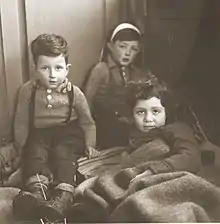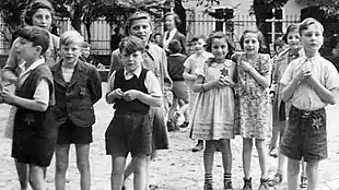 Over the lifetime of the ghetto, about 15,000 children lived in Theresienstadt, of whom about 90% perished after deportation.[6] The Youth Welfare Office (German: Jugendfürsorge) was responsible for their housing, care, and education.[92] Before June 1942, when the Czech civilians were evicted from the town, children lived with their parents in the barracks and were left unsupervised during the day.[55] After the eviction, some of the houses were taken over by the Youth Welfare Office for use as children's homes. The intention was to keep the children somewhat insulated from the harsh conditions in the ghetto so that they would not succumb to "demoralization". Aided by teachers and helpers recruited from former educators and students, the children lived in collectives of 200–300 per house,[93] separated by language.[79] Within each house, children were assigned to rooms by gender and age. Their housing was superior to that of other inmates and they were also better fed.[94]
