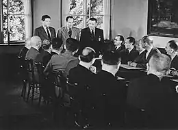 The ICRC, having come under increasing pressure from Denmark,[127] Jewish organizations and the Czechoslovak government-in-exile to intervene in favor of Jews, requested to visit Theresienstadt in November 1943.[128][129] It is unclear to what extent the ICRC valued making an accurate report on Theresienstadt,[130] given that it had access to independent information confirming that prisoners were transported to Auschwitz and murdered there.[lower-alpha 3] The Danish government also pressured the Nazis to allow a visit, because of the Danish Jews who had been deported there in late 1943. On a visit to Denmark in November 1943, Eichmann promised the Danish representatives that they would be allowed to visit in the spring of 1944.[39][46] In late May, Eppstein, Zucker, and other Theresienstadt leaders were allowed to sign SS-dictated letters, which were sent to the Aid and Rescue Committee, a Jewish organization in Budapest. Rudolf Kastner, the leader of the committee, forwarded the letter abroad, causing an unduly positive impression of Theresienstadt to develop outside German-occupied territory.[134] The commission that visited on June 23, 1944, included Maurice Rossel, a representative of the ICRC; E. Juel-Henningsen, the head physician at the Danish Ministry of Health; and Franz Hvass, the top civil servant at the Danish Foreign Ministry.[46]