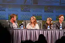 In May 2009, Chris Hemsworth was in negotiations to portray the title role after a back-and-forth process in which the 25-year-old actor was refused early on, then given a second chance to read for the part. Hemsworth's brother, Liam also auditioned for the role, but was passed on by Marvel Studios head Kevin Feige.[11] Kevin McKidd had also been considered for the role.[90] The next day, Marvel announced that Tom Hiddleston, who had worked with Branagh before and had initially been considered to portray the lead role, had been cast as Loki.[19] In June 2009, Feige confirmed that both Hemsworth and Hiddleston had signed on.[91] Feige mentioned that the film would take place on both modern day Earth and Asgard but Thor's human host, Dr. Donald Blake, would not be included.[91] In July 2009, Marvel announced that Natalie Portman would portray Jane Foster.[15] Jaimie Alexander and Colm Feore were reported to have joined the cast in September, with Alexander portraying Sif and Feore's role unrevealed, though it was thought to be a villain.[49] In an interview with Swedish news site Ystads Allehanda, Stellan Skarsgård stated that he had joined the cast, though he did not specify his role.[22] By late October Anthony Hopkins had been cast as Odin in the film.[42] The following month, Marvel announced that they had cast the Warriors Three; Fandral was to be played by Stuart Townsend, Hogun was to be played by Tadanobu Asano and Volstagg was to be played by Ray Stevenson.[28] Idris Elba was announced to have joined the cast, portraying Heimdall.[30] Natalie Portman revealed that Kat Dennings would be involved in the project, portraying Darcy, a coworker of Portman's Jane Foster.[37][92]