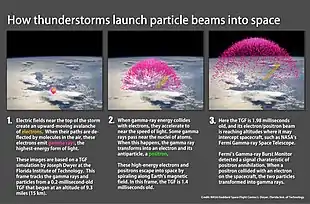 The Fermi Gamma-ray Burst Monitor results show that gamma rays and antimatter particles (positrons) can be generated in powerful thunderstorms.[100] It is suggested that the antimatter positrons are formed in terrestrial gamma-ray flashes (TGF). TGFs are brief bursts occurring inside thunderstorms and associated with lightning. The streams of positrons and electrons collide higher in the atmosphere to generate more gamma rays.[101] About 500 TGFs may occur every day worldwide, but mostly go undetected.