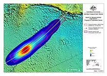 In May 2014, planning for the next phase of the search was initiated. A bathymetric survey was carried out to measure the seafloor topography in the areas where the next phase was conducted; the survey charted 208,000 km2 (80,000 sq mi) of seafloor topography and continued until December that year.[8] An underwater search began in October 2014 but failed to recover anything of value and was suspended in January 2017 after searching 120,000 km2 (46,000 sq mi) of the southern Indian Ocean.[9] On 29 July 2015, a flaperon from Flight 370 was discovered on a beach in Réunion, approximately 4,000 km (2,500 mi) west of the underwater search area; this location is consistent with drift from the underwater search area over the intervening 16 months.