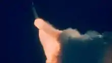 | The flame burns through the lower attachment strut on the right-hand SRB, causing the SRB to move away from the ET. | |||||||