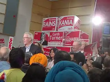 Dion makes a speech on October 10, 2008 in Brampton West. Former Prime Minister Jean Chrétien, Sheila Copps, Gerard Kennedy, and Michael Ignatieff were among notable Liberals at this rally.