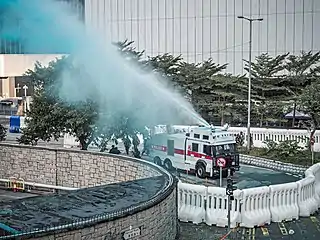 However, the police's clearance action, which saw blue-dyed water being sprayed on the gates of the mosque, led to condemnation from CHRF and the Muslim community in Hong Kong. Volunteers arrived an hour later to help clean the gate, while the police issued a statement saying that the mosque had not been its intended target and apologized to the mosque.[68] Carrie Lam later followed up with an official apology.[69] Former Indian Association of Hong Kong president Mohan Chugani, who was sprayed outside the mosque alongside lawmaker Jeremy Tam and businessman Phillip Khan, refused to accept Lam's apology, while Khan believed that the police intentionally sprayed the mosque and that the act was an "insult to the Islamic religion".[68][70]