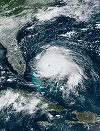 - 16:40 UTC (12:40 p.m. EDT) at 26.5°N 77.0°W – Hurricane Dorian reaches its peak intensity with maximum sustained winds of 185 mph (300 km/h) and a minimum pressure of 910 mbar (26.87 inHg), and simultaneously makes landfall at Elbow Cay in the Abaco Islands of the Bahamas.[15]