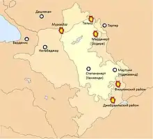 According to the Armenian MoD, the overnight situation along the front was relatively stable, but tense.[124] At approximately 09:00, the Azerbaijani MoD stated that Armenian forces were rocketing Tartar City and Horadiz.[125] At around 10:30, the Ministry stated that Armenian forces were shelling Fuzuli District, while rocketing Agdam and Tartar Districts,[126] while the Artsakh MoD stated that Azerbaijani forces were shelling Stepanakert.[127] Approximately half an hour later, Ganja came under bombardment.[128][129] The Armenian MoD denied that this came from its territory,[130] while Artsakh took responsibility, stating that Armenian forces had targeted and destroyed the Ganja military airbase on Ganja International Airport;[131] Azerbaijan issued a denial.[132] Subsequently, both a correspondent reporting from the scene for a Russian media outlet and the airport director denied that the airport, which was not operational since March due to the COVID-19 pandemic, had been shelled.[133][134] At approximately 14:00, Azerbaijan stated that Azerbaijani forces had severely wounded the President of Artsakh during a visit to the front;[135][136] Artsakh issued a denial.[137] At around 16:00, the Azerbaijani MoD stated that the Armenian forces were shelling Sarıcalı in Aghjabadi, several settlements in Agdam District, and Şahvəlilər in Barda Districts.[138] Approximately 40 minutes later, Azerbaijani President Aliyev stated that Azerbaijani forces had taken control of the city of Jabrayil,[139] as well as several settlements in Jabrayil District.[140] At around 17:80, the Armenian MoD released footage apparently showing Azerbaijani soldiers leaving Mataghis.[141] At approximately 22:40, the Azerbaijani MoD stated that Armenian forces had rocketed Tartar City and Mingachevir,[142] the latter housing a water reservoir,[143] which Azerbaijan reported that Armenia regards as a military target;[144][145][146] both Armenia and Artsakh issued denials.[147] Around an hour later, the Azerbaijani authorities stated that Armenian forces had fired two medium-range missiles at Khizi and Absheron Districts.[148]