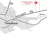 The airport is located 12 km northeast of the center of Timișoara.[14] Access to the airport is via Calea Dorobanților and the European route E70, through a roundabout near the village of Ghiroda. A slightly longer alternative (but with less traffic flow) is to exit Timișoara on Calea Dorobanților and drive through the village Giarmata Vii instead, before heading back towards the airport. A third option, starting in the northern part of the city, is to use the ring road (DNCT) which, also through a roundabout, is connected with the road to the airport.